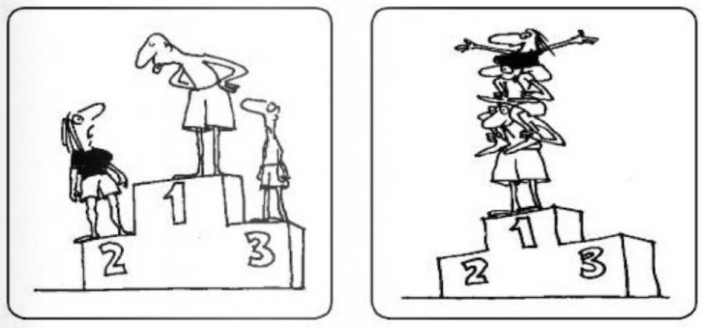La compétition est partout. Dans le sport, dans les écoles, dans les entreprises, partout. Elle pousse à se réjouir quand d’autres font des fautes, n’est-ce pas incroyablement malsain ? Aucune forme de compétition ou de concurrence n’est saine. C’est la coopération qui est saine.