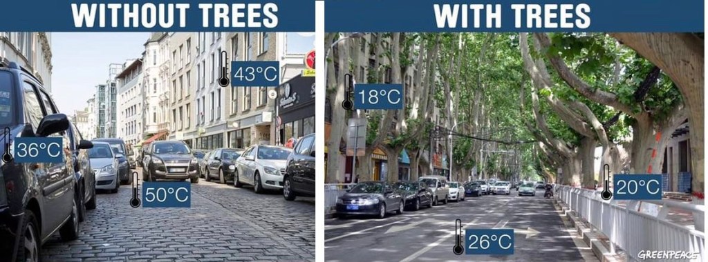 Enfin il est temps de … planter des arbres partout pour lutter contre les vagues de chaleur. Une rue arborée et c’est 10°C à 20°C de température ambiante en moins d’après Greenpeace. J’ai vraiment vu la différence à 西安 Xi’An en Chine entre le quartier musulman très arboré et la ville chinoise bétonnée.